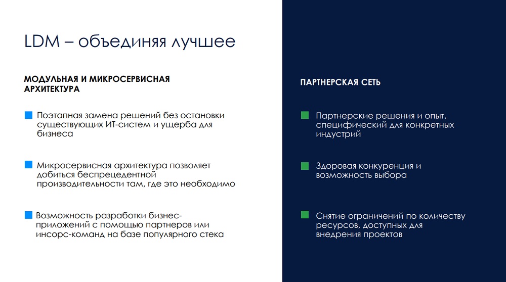 «Платформа LDM предоставляет возможность инсорс-команде заказчика или ее партнерам разрабатывать собственные бизнес-приложения на базе нашего технологического стека. Партнерские внедрения являются нашим фокусом при создании платформы. Опыт сторонних разработчиков в конкретных специфических отраслях дает рынку здоровую конкуренцию, а заказчику – возможность не быть ограниченным ресурсами одного отдельного подрядчика, – комментирует Михаил Данилов. – Микросервисная архитектура, с одной стороны, позволяет получить беспрецедентную производительность там, где это необходимо. С другой стороны, ее повсеместное применение накладывает серьезные требования к ландшафту. LDM имеет микросервисную архитектуру ключевых компонентов, и можно вести разработку приложений на ее базе. Но если приложение доставляется единым блоком и в микросервисах нет необходимости, вы можете не усложнять свой ИТ-ландшафт».