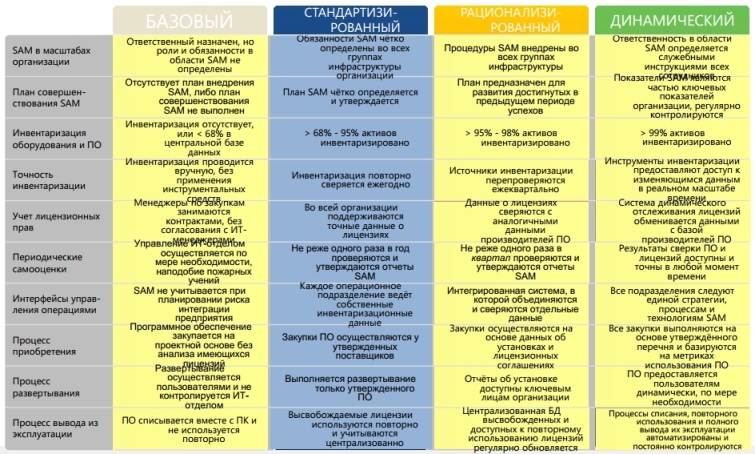 Как объяснил Константин Никитин, в методологии SAM определяются нескольких уровней зрелости организации. «Базовый» уровень зрелости может начинаться с процедуры легализации программного обеспечения, «стандартизированный» уровень уже подразумевает более высокую точность инвентаризации ПО, закупка лицензий осуществляется уже через взаимное согласование между менеджерами компании и ИТ-руководителями (не должно быть хаотической покупки ПО разными сотрудниками организации), а отчеты SAM проводятся не реже одного раза в год. «Рационализированный» уровень зрелости подразумевает внедрение процедур SAM во всех группах инфраструктуры, инвентаризацию до 98 % активов, ежеквартальные проверки и отчеты SAM, а также наличие интегрированной системы, позволяющей сверять информацию из всех корпоративных баз данных. Самым «высшим пилотажем» зрелости в управлении лицензиями можно назвать «динамический» уровень, при котором практически все активы инвентаризированы, все процессы контролируются в динамике, ПО поставляется по запросу, автоматически устанавливается и удаляется, результаты сверки ПО и лицензий точны и доступны в любой момент времени.